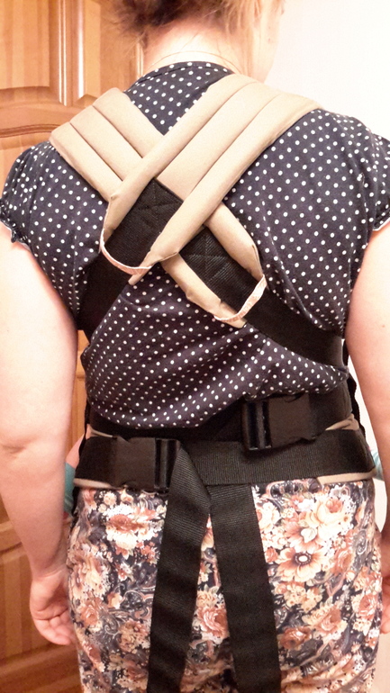Застегивайте пояс плотнее примерно на верхней трети бедра. При этом пришивная часть спинки будет выше пупка. Она условно задает уровень коленей. Попа малыша после посадки будет на уровне Вашего пупка.