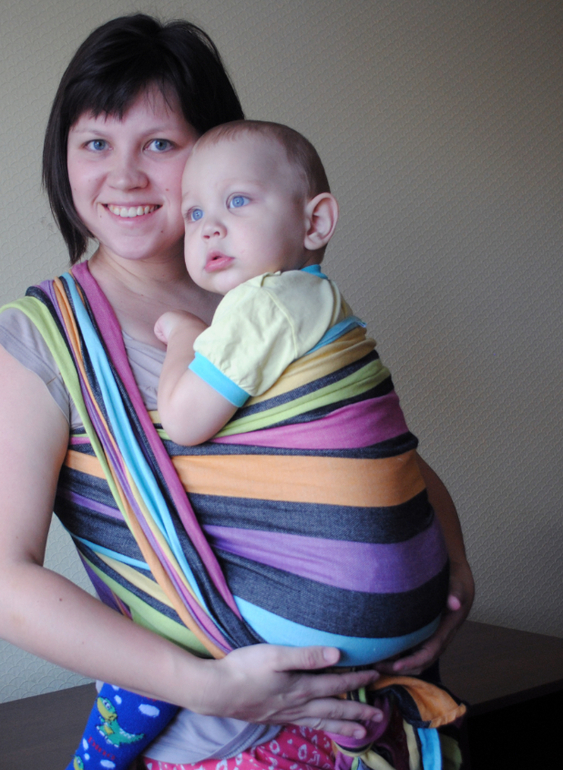 Меня зовут Анна, а слингокарапуза Миша. Хотелось бы немного рассказать о нашем опыте. Уже полгода у нас в закромах лежит шарфик от Little Frog расцветки Флюорит со льном в размере 3,6 м. Вот такой красавец (фото производителя).