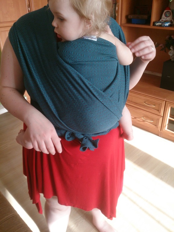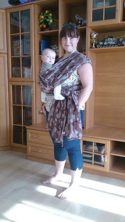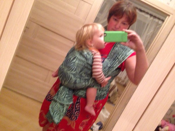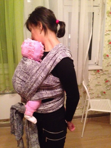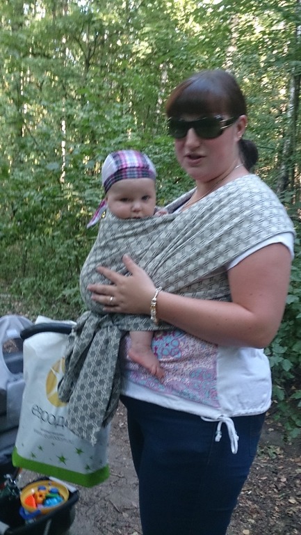 Затем у меня появился второй шарфик: коровка от Нати, размером 7. И вместе с ним осознание того, что моя слингожизнь никогда не будет по-настоящему долгой и счастливой, потому что моя фигура не позволяет мне выводить хвосты слинга вперёд при стандартной намотке КНК. Это было ударом! В связи с этим я принялась изучать новые виды намоток, при которых даже стандартные размеры шарфов я могла бы наматывать так, как мне нравилось. Поэтому остаток лета моими любимыми намотками были «кенгуру» (получалось плохо и почти никогда с первого раза) и «крест из 8-ки» - всё хорошо было, но смущало, что у ребёнка нет нормальной поддержки спинки, столь необходимо в данном возрасте и, в связи с этим, ограничение по времени ношения. Выглядело это так: