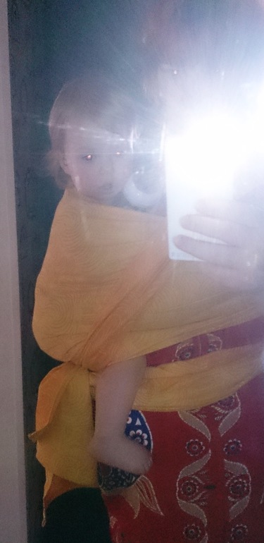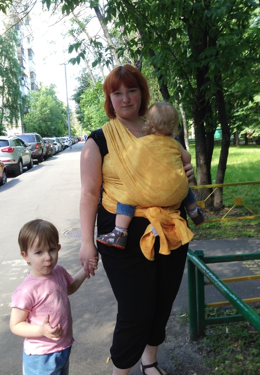Одновременно с этими событиями я сделала заказ на первый в своей жизни кастом. При заказе просила производителя соткать самую длинную длину из возможных) И на этом этапе меня озарило: ведь можно же обратиться напрямую к производителям, с просьбой соткать/пошить/порезать нужную мне длину шарфа! Возможно, кому-то это с самого начала могло показаться элементарным, но до меня вот доходило очень долго, в течение почти целого года. И на деле оказалось довольно просто: ведь многие производители (особенно начинающие) слингов заинтересованы в продажах, и очень охотно идут на контакт и выполняют пожелания клиента. Я бы отметила среди них всё тот же LittleFrog, руководителю которого я писала письмо на ломанном английском, пытаясь объяснить, чего же, собственно, я от него хочу (а хотела я 8-ку жаккарда солнечно-жёлтого цвета). Всё решилось в течение получаса, а ещё через 10 дней я уже намотала этот шарф - и это было попадание в точку, хвосты выводились вперёд на 11кг детке и мне, по-прежнему 52-го размера!