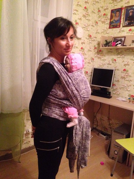 Когда родилась младшая дочь (моя нынешняя и основная слингожительница), я уже знала, что буду носить её в шарфах. Носить буду долго и много! И ещё в беременность мною был припасён трикотажный шарфик MobyWrap))) Как ни странно, именно он положил начало восхитительному увлечению под названием «шарфянка». Первым моим «настоящим» шарфом стал Дидимос Пудер в 6 размере. Вот так счастливо я выглядела в нём первые 3 месяца жизни дочки: