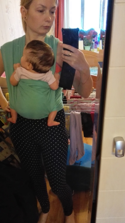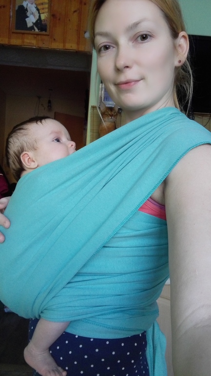 Учимся носитьКупила себе для начала трикотажный шарфик. На улицу пока не рискуем выходить, привыкаем дома.