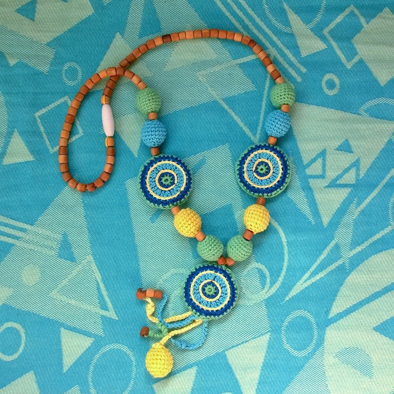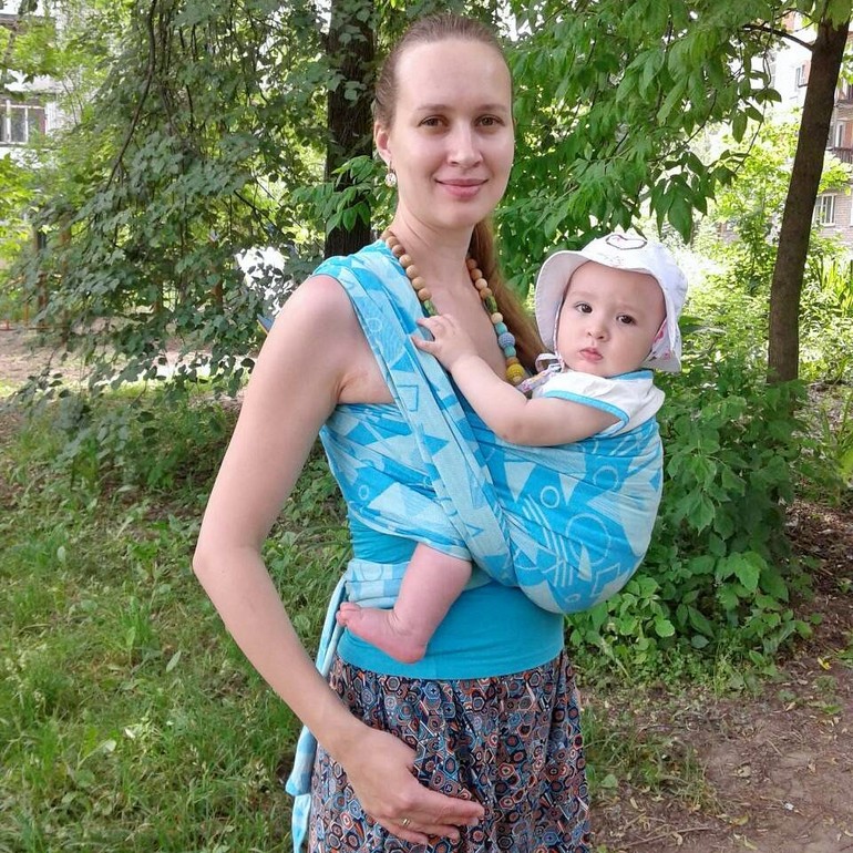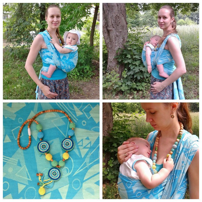 Уточним. Мама Маша размер 42-44, слингоДочь Злата 8,5 месяцев и 8,5 кг.. Цвет шарфика очень летний: бирюзово-лаймовый. Оказалось, что эта расцветка идеально вписалась в мой летний кормительный гардероб. Кот и Пес на шарфе в намотке не сильно определяются, ибо рисунок весь геометрический. Расцветка шарфа двухсторонняя, но не сильно отличается по насыщенности цветовой гаммы.