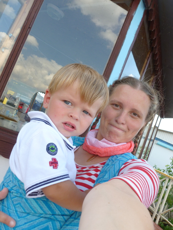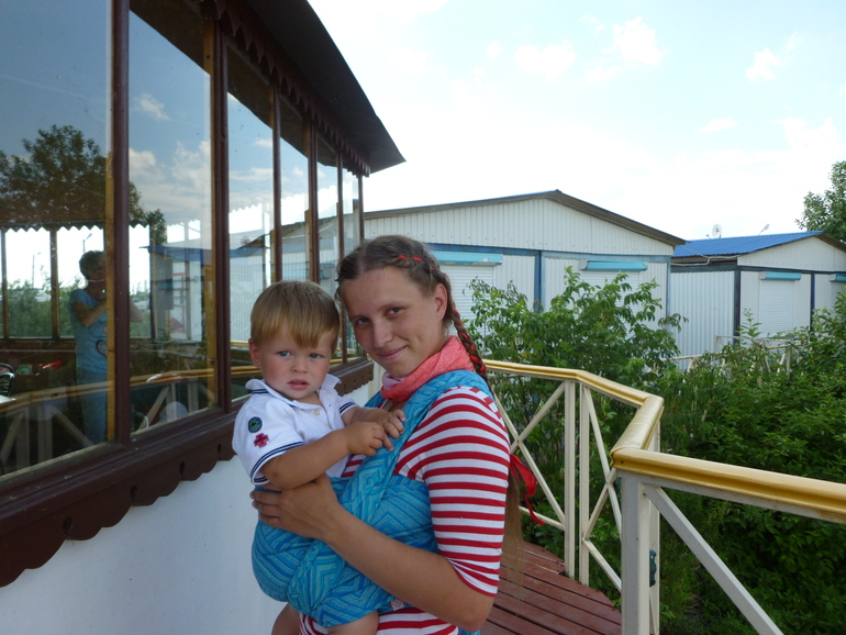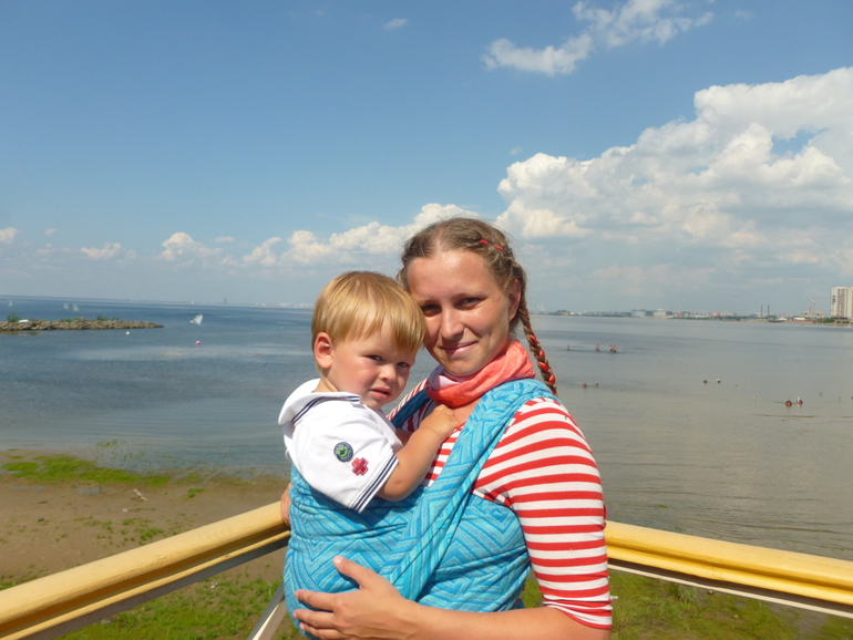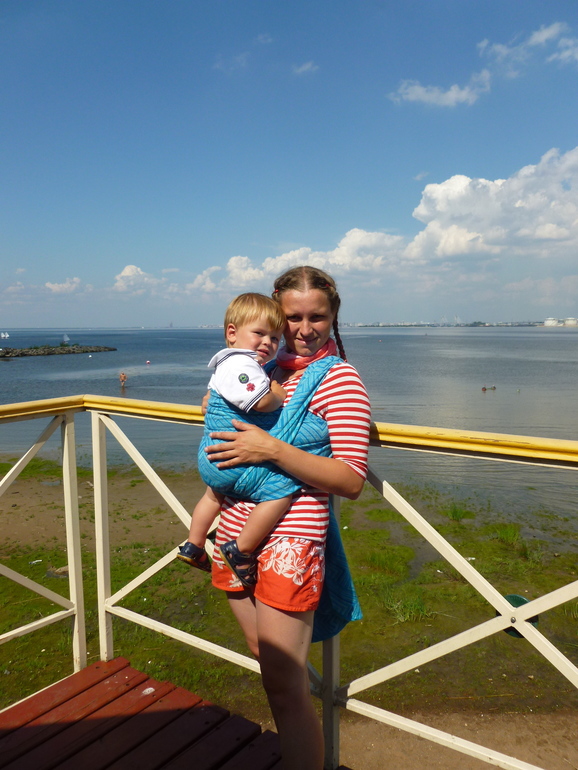 На мне красно-белая туника-тельняшка от вместе, красно-белые шортики, в волосах красные ленты, красно-белый легкий шарфик, а на сыне белая футболочка-поло, планировались красные шортики, но сын их облил водой и пришлось снять... Слинг у нас мокошь айири бирюза. Слинг очень приятный, мягкий, грузовозный, довольно толстый (по крайней мере в сравнении с другими моими шарфиками), а цвет и рисунок просто прекрасен)