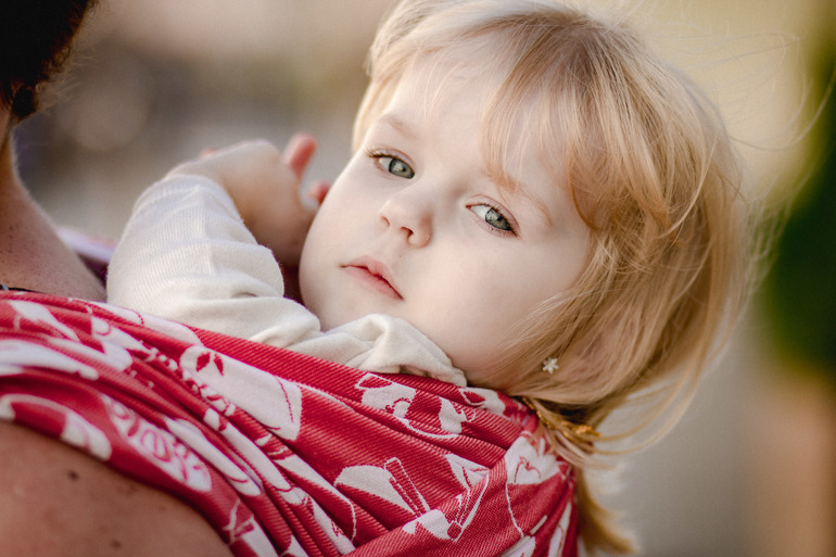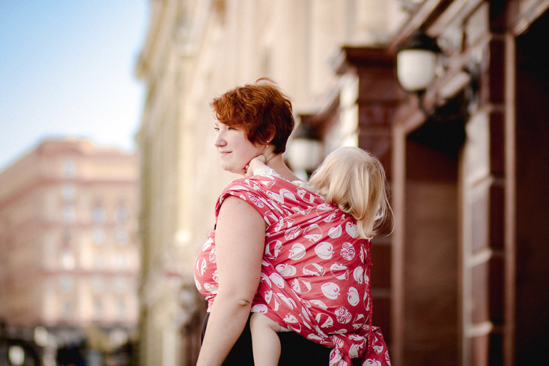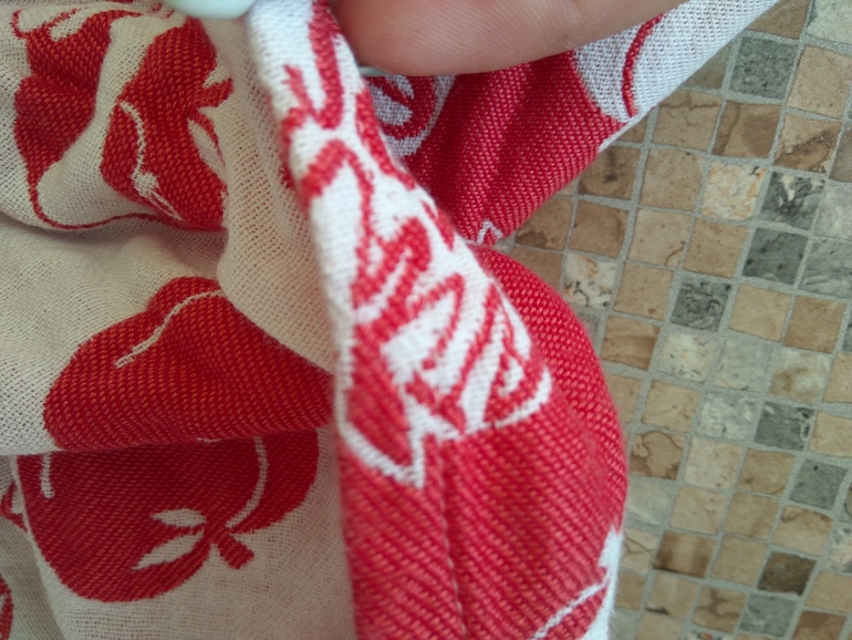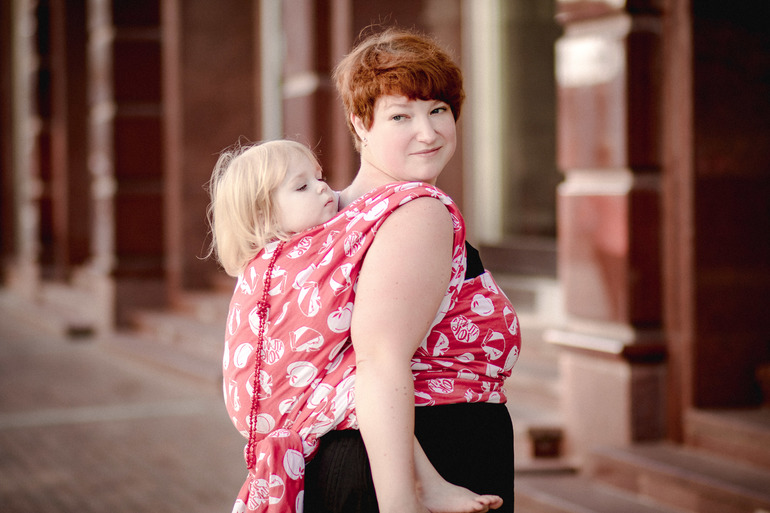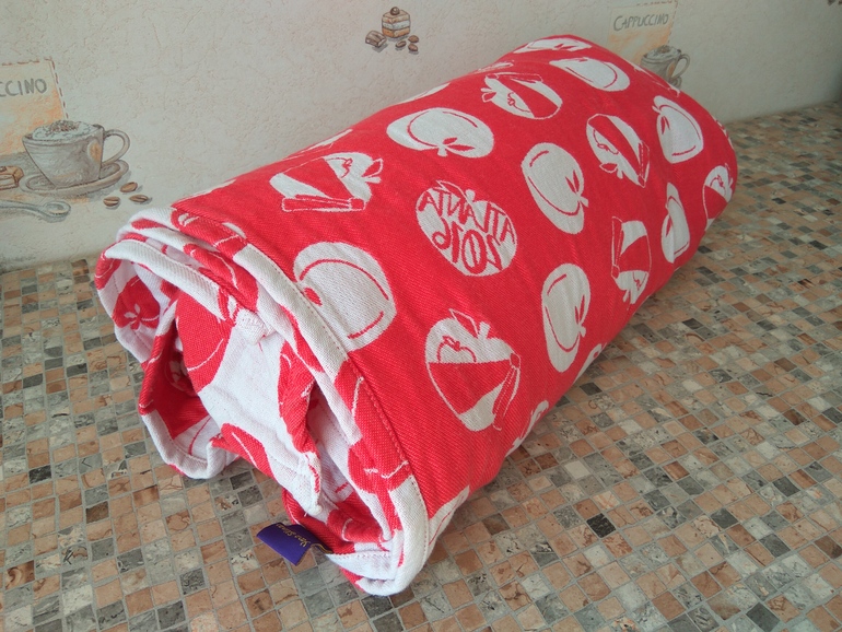 Шарф тяжёлый. Белая сторона (тот самый тенсель) рыхлая-рыхлая, реально как марля. Это идеальный вариант для тоддлеров: цепкий, грузовозный, обладающий способностью растворять в себе вес ребёнка. Имхо: не для жары, и не для малышей (килограмм до 8 точно) - они там потеряются.
