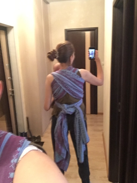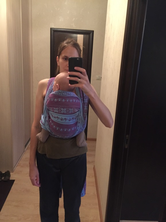 Учимся носитьДобрый день, милые Ббшечки! Подскажите что поправить? Первый раз попытались намотаться! А где ручки должны быть? Масик их сложил между мной и собой и пытается ими отталкиваться от меня!