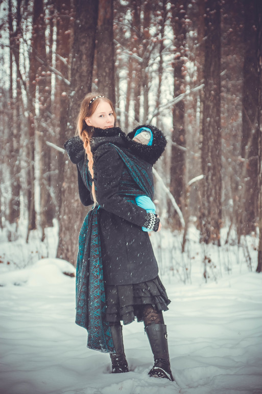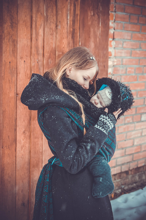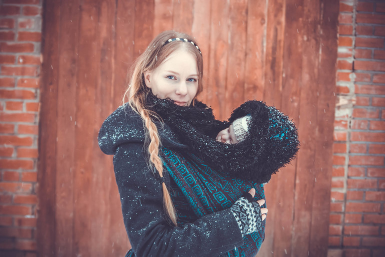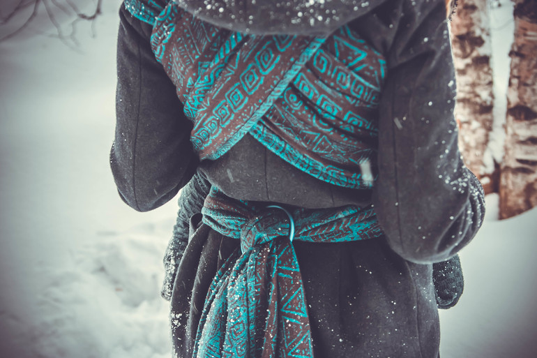 Седьмой размер в кнк с рингфинишем оставляет длинный роскошный хвост, но с узлом чувствуется как шестерка. На пальто намотался без проблем, и Настёна почти сразу в нем уснула. Пока гуляли по лесу, намотка не расползлась, а дочкины 8 кг почти не чувствовались.