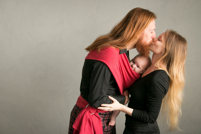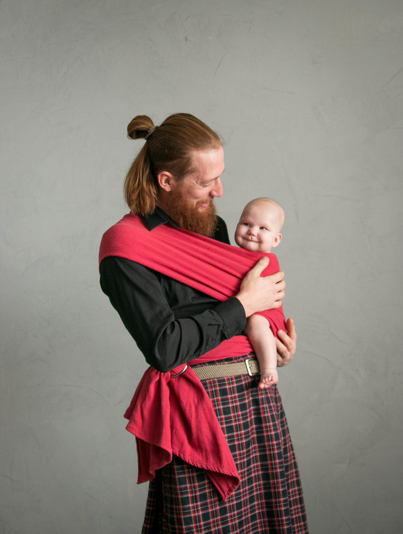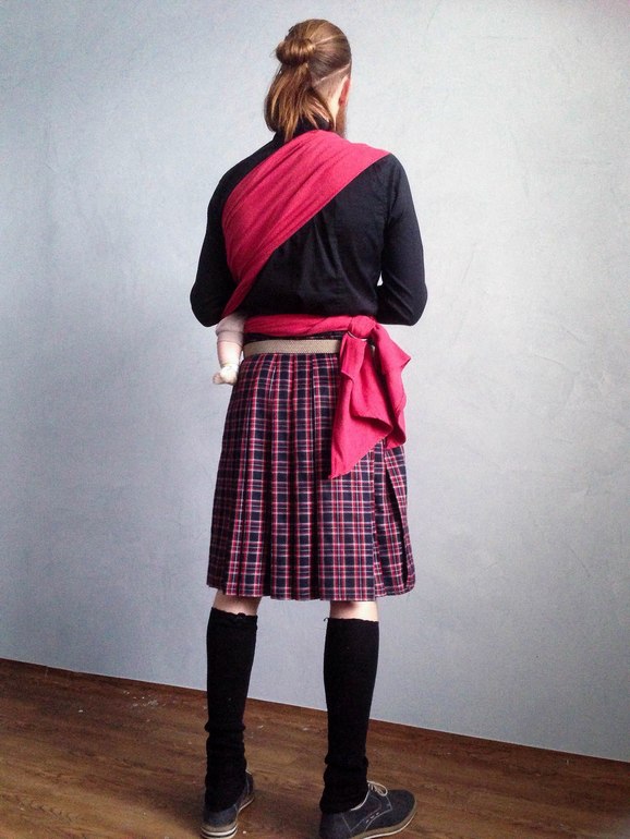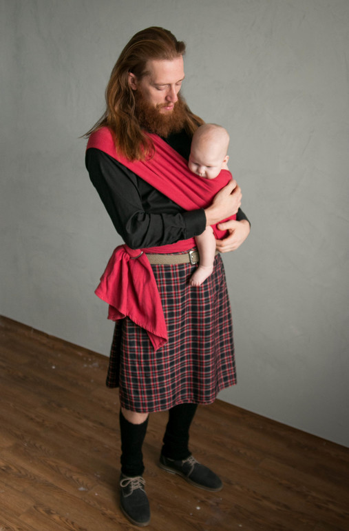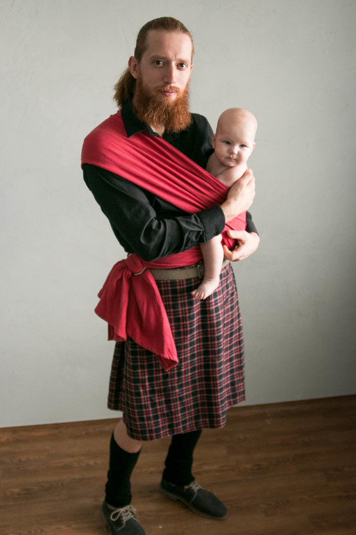 О шарфе: Дидимос Лиска Бургунд, 2 размер, хлопок. Лёгкий и красивый, пока что носили его только дома, обычно мотаю на себя рюкзак или использую как палантин на прогулке. Приятный яркий шарфик отлично вписывается в образ благодаря универсальности расцветки и плетения. Получилась такая шотландская классика: рыжий мужчина с бородой и в черно-красном одеянии.
