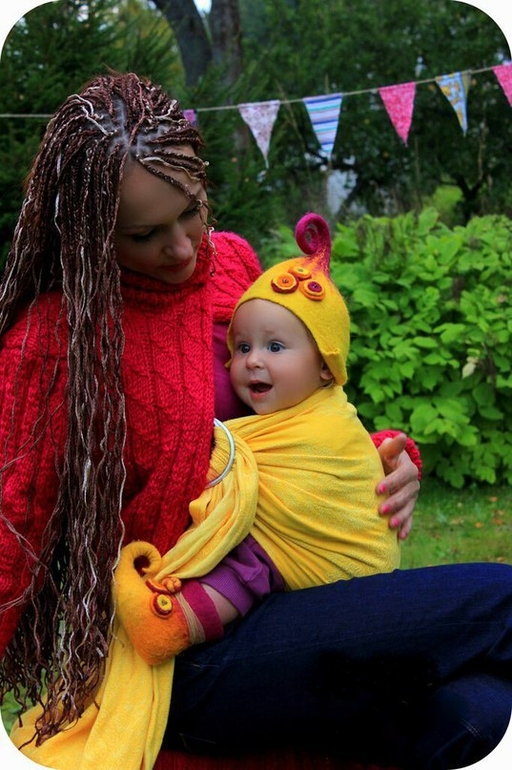 Я из тех слингомам, которых сразу мыслят цветовыми сочетаниями и конкретными аксессуарами. Еще будучи беременной я увидела сваленные из шерсти гномичьи ботиночки мастерицы из Литвы и они запали в мою творческую душу глубоко и надолго. Потом так же долго я их ждала... потом дождалась свою малышку, а уже потом появился ССК Ellevill Diva Essenza Lemon и идеально вписался в образ! Он нашел нас, а мы его. Солнечно-лимонная расцветка и сказочный принт - пэйсли у меня всегда ассоциируется со сказкой.