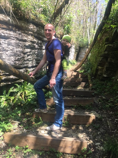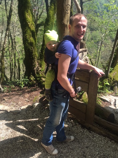Прогноз такого тепла не обещал, и мы решили быстро скорректировать наши планы, дабы не терять драгоценные тёплые дни! На следующий же день после прилёта мы решили отправиться на какую-нибудь пешую прогулку по зелёным местам и выбрали тисо-самшитовую рощу. Это своего рода заповедник, с несколькими пешими маршрутами для посетителей. Конечно, никакая коляска там в принципе проехать не может, ведь это просто тропа с камнями и корнями деревьев посреди леса, подъемами и спусками, ведущими к бирюзового цвета горной реке! Поскольку с нами был наш сын Егорка, которому сейчас год и 8 месяцев, вес 12 кг, ходит сам, но, конечно, ещё не в силах одолеть 7 километров такого пути, нашим единственным вариантом совершить прогулку был слинг! В данном случае, любезно предоставленный для тест-драйва магазином Naturebaby эргономичный рюкзак Action Baby Carrier. До этого мы активно пользовались шарфом и май-слингом, а вот рюкзак пробовали впервые. Да и папа наш носил в мае Егорку не так часто. Также я до этого не носила сына за спиной.