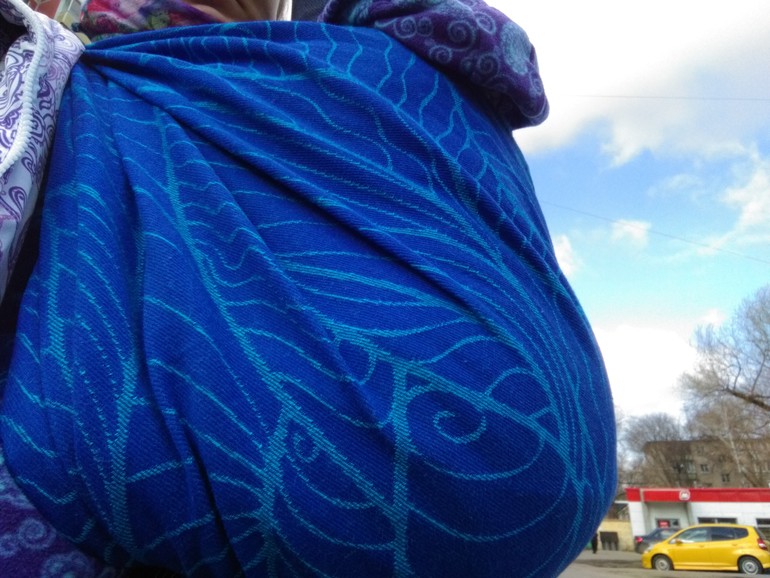 В однослойных намотках мне не очень нравится из-за длины. Рюкзак я не люблю, кенгуру познова-то для пассажира, а в усеченном кнк мне не нравится узел под попой. Поэтом носила я его обычно в Поппинс, в заспинном ДР, в Робин на полубедре, в полуКНК с узлом на плече, в кресте из 8ки. Чаще всего на подхват: добежать до машины, до ближайшего магазина, завести дочь в музыкалку.