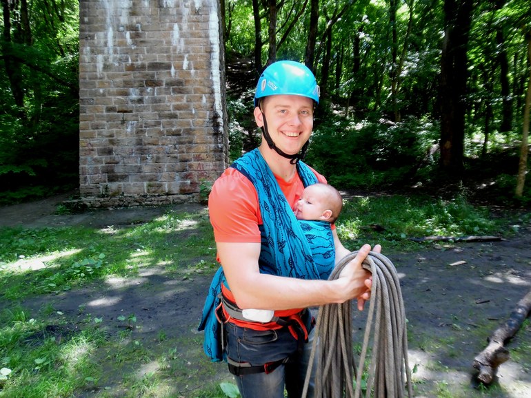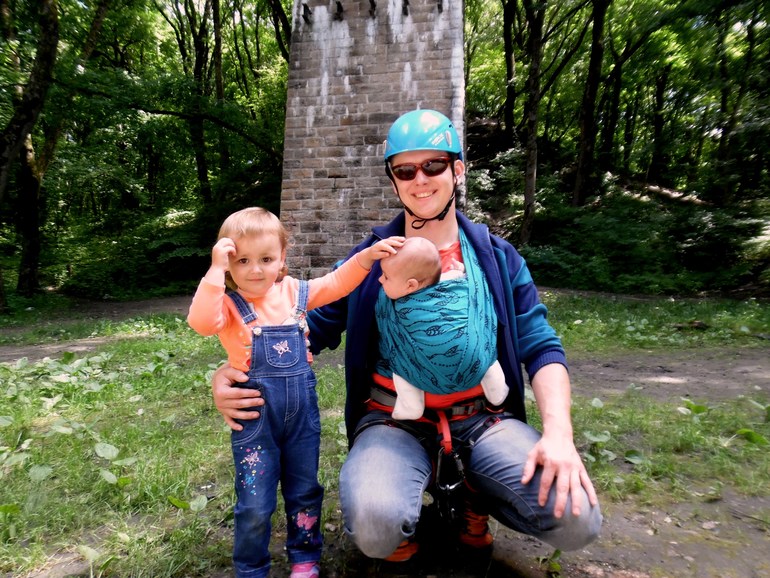 Изначально к участию в конкурсе собиралась привлечь нашего слингопапу, но он заболел, поэтому пришлось подменить его слингокуму. Долго думать с тем, какое направление выбрать не пришлось- все мы из альпинисткой тусовки, поэтому этот вид спорта и отразился в нашем слингостильном образе.