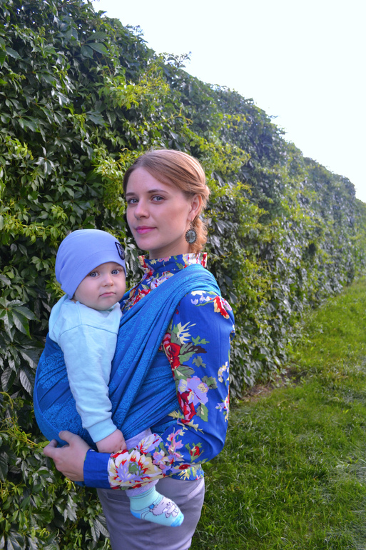 Теперь о слинге. Это Diva Esssenza Ceruleo, 100 % хлопок. Как уже можно заметить, к Дивам я неравнодушна. А расцветка Черулео меня действительно зачаровала) Глубокий зелено-синий цвет с одной стороны и бирюзовый с другой. Волшебное сочетание и мое любимое! Слинг ооочень мягкий,пластичный,обнимательный. Наши 10 кг несет легко и непринужденно. В нем одновременно не жарко и не холодно.