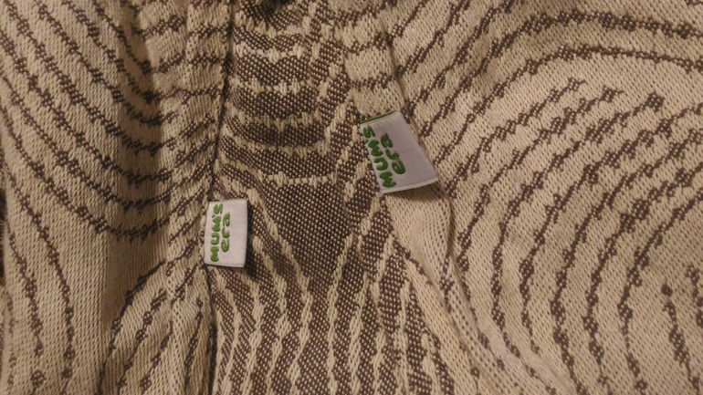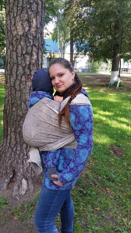Получила я Энигму вечером, пощупала, пообнимала и отложила до утра. Утром бегом собиралась на слинговстречу, радостно намотала фронтальное двойное ребозо и получила первый сюрприз - мне не хватило длины. Я - девушка крупная, база у меня 7, но на фронтальное др базы-1 обычно хватает. Понимая, что я опаздываю, и времени перематываться просто нет, на ходу подняла ребенка выше, максимально утянула и завязала прямо на кончиках. Не смотря на это, через несколько минут носки начал фалдить верхний борт. Кто носил фронтальное ДР знают, в этой намотке верхний борт обычно прибитый.