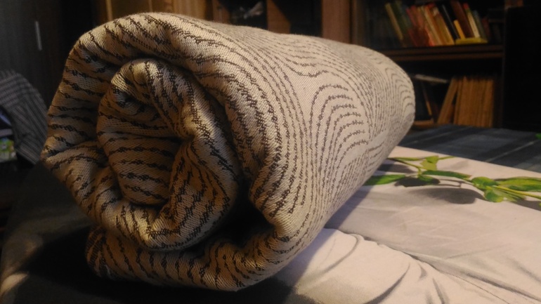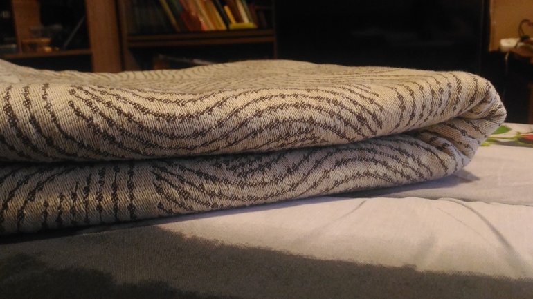 Разобравшись с особенностями поведения полотна, я дала Энигме еще один шанс и намотала кенгуру. Хотя это явно не тоддлер-френдли намотка, но позволяет хорошо отследить поведение полотна, если задаться такой целью. Так вот при очень тщательном вдумчивом подтягивании намотка не ползла, но через некоторое время верхний борт все равно начал фалдить. Объяснение у меня только одно - нити в полотне слишком подвижны, оно слишком пластично, по свойствам ближе к трикотажу. Думаю, меньший вес этот шарф будет нежно обнимать, приятно провисать и деликатно баунсить. Но 14 кг - это слишком много для этого шарфа.