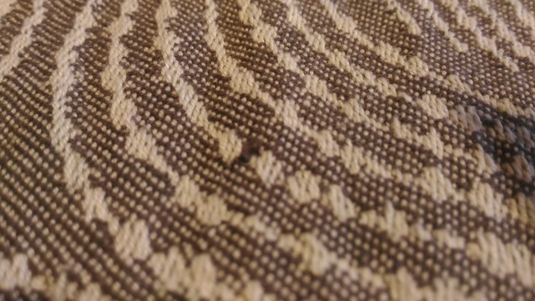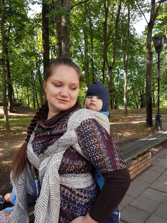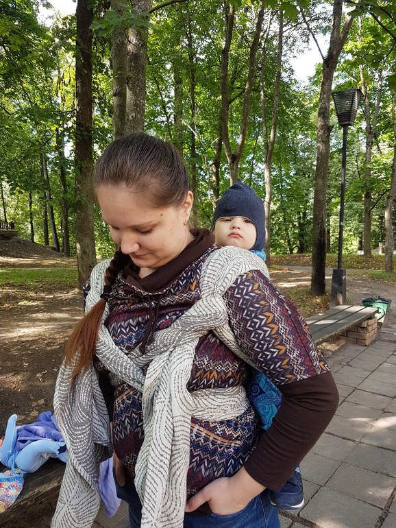 Со встречи шли в рюкзачной намотке, но плечи мои были не рады. 14 кг явно слишком большой вес односнойных в этом шарфе. Вернувшись домой долго пыталась понять, что не так и почему намотка разбалтывается. Обмоталась под кнк и гоняла слобину туда-сюда без ребенка. По ощущениям, полотно расправленное очень цепкое, протянуть шарф объективно тяжело, хотя я привыкла и Хопповские коврики тянуть и Халиф, и пухлые трививы. Энигма по сравнению с ними тянется очень плохо. Но при этом, полотно рыхлое, нити в нем подвижны относительно друг друга, поэтому шарф ведет себя как тонкий и скользкий - в нем слабины возникают локально, нужно очень тщательно его подтягивать мелким перебором, пополосно в 6-7 движений. От пухлых шарфов обычно не ожидаешь такого поведения. Тут же малейшая небрежность приводит к тому, что в кресте на спине или в жгутах сохраняется слабина и в носке срабатывает эффект лифта - ребенок опускается низко, намотка ослобевает и нести становится тяжело. При этом еще шарф трудно подтягивать, чисто физически.