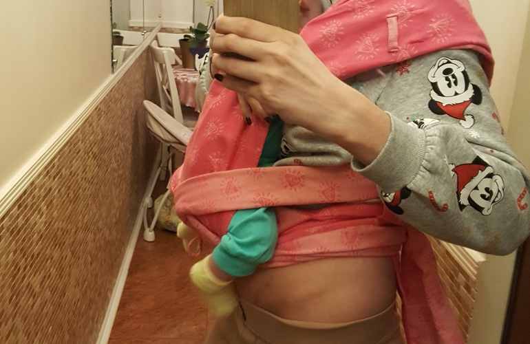 Ваш слинг мне кажется слишком плотным, нет в нём обнимательности.