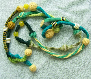 шнур вязанный. Мать-и-мачеха. Состав: можжевеловые бусины, хлопок, пластиковые бусины, длина 157 см. в наличие. 1200 руб.