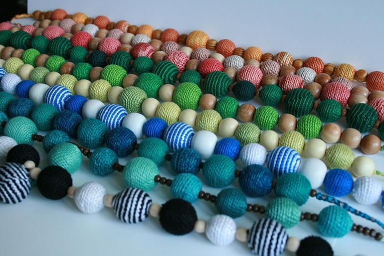 Материал: 13 обвязанных хлопком можжевеловых бусин, 18 можжевеловых бусин без лака, атласные ленты.