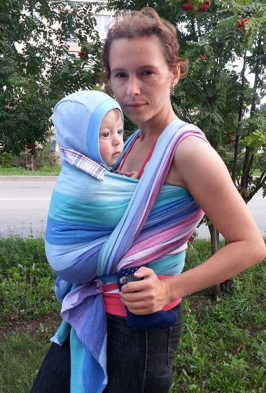 На фото годовалый сынок 10 неходячих кг....легко)). Завязан на один узел, подтягивать не приходится.