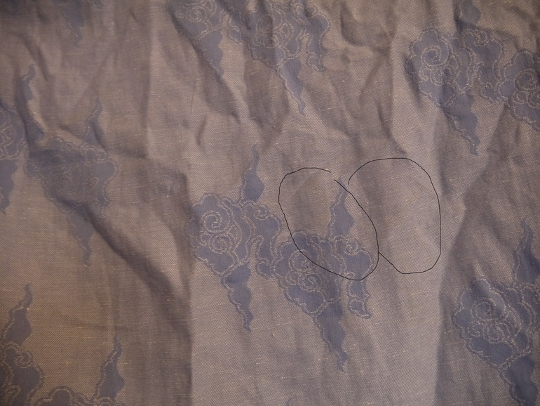 пятно на кармане и на скосе с одной стороны, но я их последний раз нашла только потому, что знала, что они есть и оооочень искала :) их не видно :)