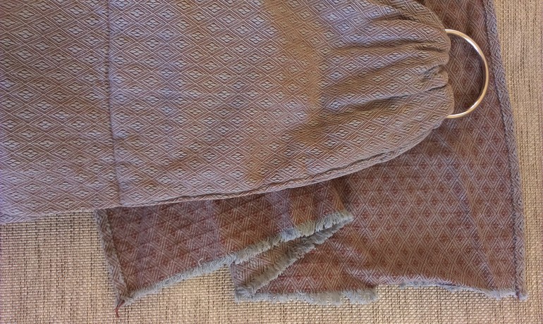Продаю слинг с кольцамиПродаю сск ЯмиМами Тигровый глаз, был размер L, укоротила до 175 см примерно (с плечом от колец). Край не подшит! Прятала хвост вокруг колец. Носили на улице, добежать до парка и вернуться домой в полтора года сына. Уже не ковер, хорошо держит.
