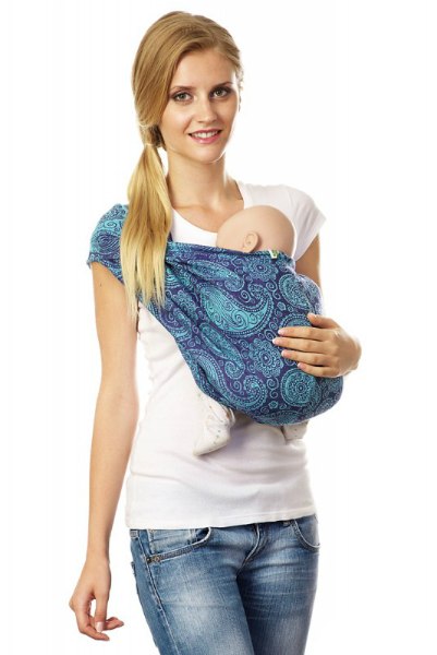 Слинг-карман надевается на одно плечо (плечи нужно чередовать), не имеет колец и регулировок, поэтому предназначен для родителей определенных размеров.