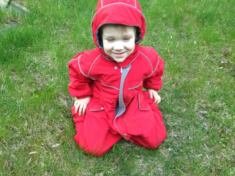 У него очень классные резинки: даже когда он сильно велик, можно носить и ничего не мешается. Маркировка - 92. По факту мы носили с 85 и вот только к 100 стал мал (но уже, конечно, в намотке ноги торчали, мы носили просто). Комбез не мембранный, верх плотная курточная ткань (извините)), подкладка мягкий серый флис. Он очень теплый (для своей сезонности): с 10 градусов мы уже носили во всю. На фотке Платон сделал страшное лицо, но виден цвет, подклад и капюшоп (фурнитура вся в порядке, все работает). Хочу 1500, но открыта к диалогу. Пятен нет, видно, что носили, но не более.