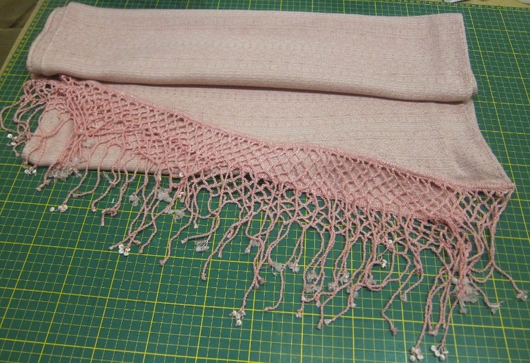 1.Палантин -коротыш из Индио Пудер в виде трапеции, длина по короткой стороне 195 см, по длинной 232 см. Сплетена бахрома из вискозы с хлопком, в цвет полотна. Бахрома украшена камушками из розового кварца с одной стороны прозрачный, с другой матовый . Состояние очень хорошее. Есть затемнение на полотне d=2 см, фотоаппарат не ловит, тк его заметно только под определенным углом. В остальном : полотно без зацепов, без дыр. В подарок льняной чехол для хранения. 3000р с почтой по РФ