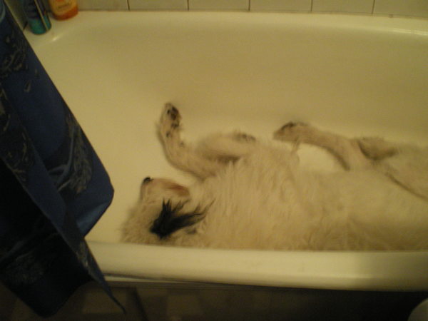 А надо сказать, мой пес УЖАСНО боится петард! Весь день на улице грохотало, и его было невозможно вытащить из ванны даже на прогулку!