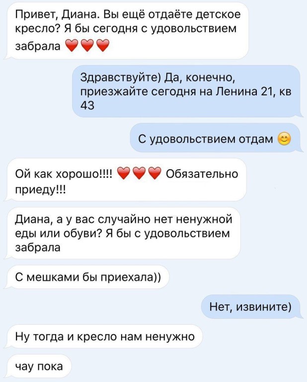 Вот поэтому я перестала отдавать даром (только знакомым), а стала продавать по 50-100-200 рублей (это если состояние вещи на "отдам даром". если нет - продажа по адекватной цене). Как ни странно, даже минимальная цена вещей на раз отсекает весь неадекват