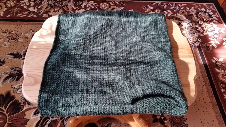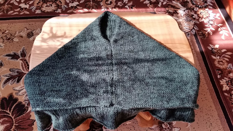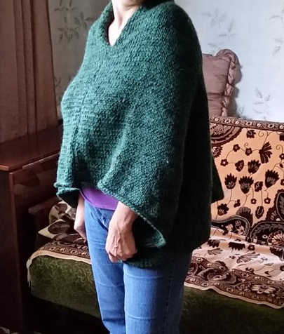 Лицевая вязка в две нити, плотная темно-зеленая и тоненькая черная. По сути прямоугольник, который потом сшиваешь по одной стороне, оставляя место для головы. Я планировала его не так носить, а чтоб шов на плече был, а углы не по бокам, а спереди и сзади.