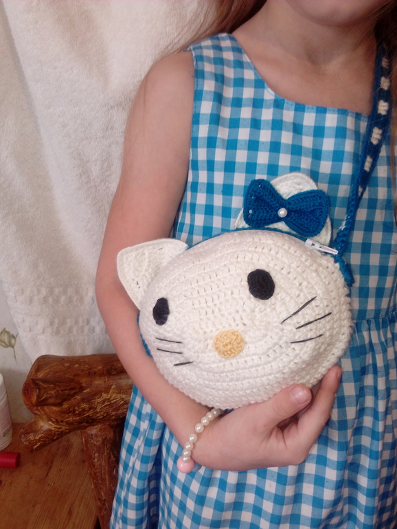 Доченька давно просила вязаную сумочку, а тут увидела подобную в интернете и спокойная жизнь моя закончилась.Пришлось взяться за крючок.Фото по кат
