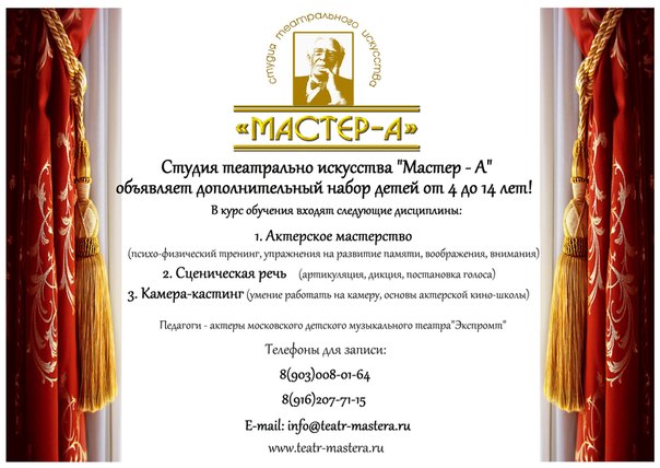 СТУДИЯ ТЕАТРАЛЬНОГО ИСКУССТВА "МАСТЕР-А" ОБЪЯВЛЯЕТ ДОПОЛНИТЕЛЬНЫЙ НАБОР ДЕТЕЙ ОТ 4 ДО 15 ЛЕТ!