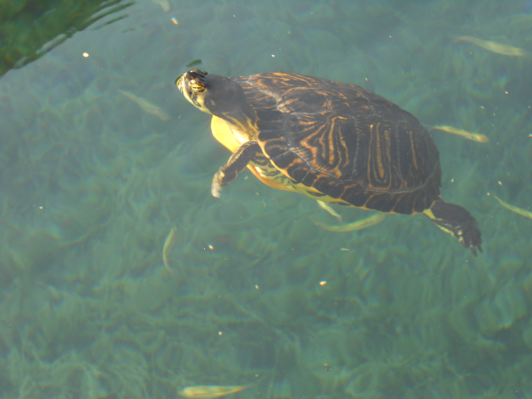 И еще красноухие черепашки. Нескольких мы видели, и они были скромные, но вот одна нам попалась, которая сама подплыла к нашему катамарану и смотрела на нас из воды. Мы взяли с собой хлеб для рыбок и уток, и решили покормить черепашку. В итоге она съела у нас весь хлебушек)))) и в благодарность попозировала нам))))