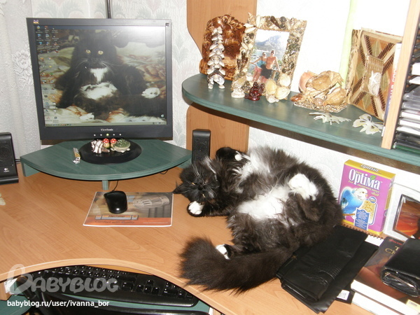 вчера за компом смотрела "Голос діти" и он запрыгнул на стол сел перед экраном ко мне мордой (типа он стеклянный)))) и начал мяукать, на что муж сказал: "Лохмандей, "голос коты" еще не придумали, так что хватит глотку рвать!"