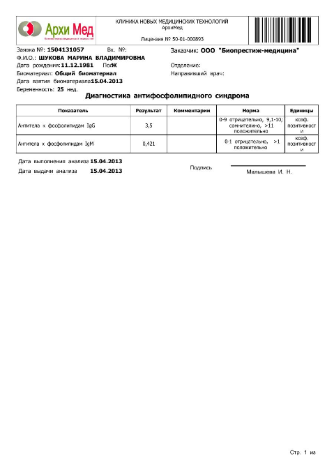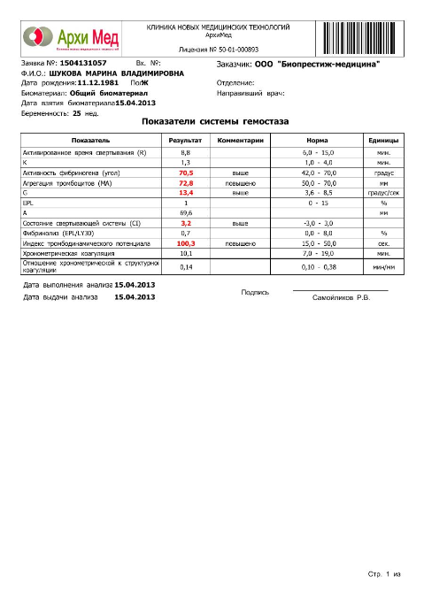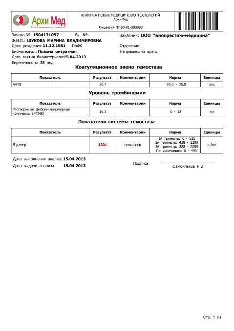 Она посмотрела меня на УЗИ .моя доча за 8 дней набрала 200 гр.головное предлежание,срок соответствует на 11 апреля 24 нед.и 4 дня.короче всё в норме.Сказала,что Д-димер -это не показатель.Почему все на него так реагируют?А я то что?Мне сказано колоть фракс вот я колю,снижаю показатель.Велела сдать анализы:общ.анализ мочи,крови и биохимический анализ крови (можно самый последний результат из ж/к),ттг чтобы был свежий,в ЦИРе сдать(там просто дешевле чем у неё в клинике в 2 раза)глюкозу+инсулин,мутации гено гемостаза 4 гена ,у неё в клинике сдать обязательно-комплекс гемостаза с тромбоэластиограммой+суммарные АФА,антитела к фосфолипидам IgG и IgM.короче все анализы,кроме те которые можно из ж/к обошись мне в 6350.Результаты готовы,кроме 4 гена.но я там ничё не понимаю.на приём к ней после того,как соберу все анализы,примерно 26.04.фракс пока сказала колоть,метипред снижать каждые 5 дней по 1/4,кардиомагнил пить по 1 т.в день.может кто -нибудь посмотрит и скажет про эти загадки анализов и расшифрует их?а то так долго до 26....я с ума сойду.