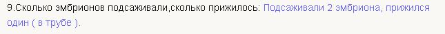 9.Сколько эмбрионов подсаживали,сколько прижилось: Подсаживали 2 эмбриона, прижился один ( в трубе ).