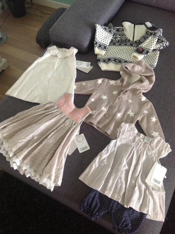 Здесь платья, которые муж выбрал в Mamas and papas. Вдруг вижу, как он резко вынырнул откуда-то из между полок с сияющим лицом и трясет победно этими платьями. Я аж прослезилась. Беленькое очень красивое. Из плотного льна с таким красивым блеском. Тут уже на следующее лето. 6-9 месяцев. Ну и норвежский шерстяной свитер ручной работы, подаренный родственниками, когда мы им сообщили, что у нас мальчик. Ну да ладно. Девочка тоже сносит. Размер на 1,5-2 годика уже, наверное.