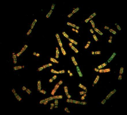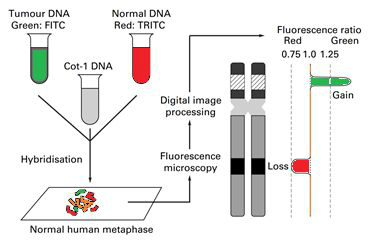 Однако мало кто знает, что столь мощный и высокоразрешающий метод, как aCGH, был разработан и применяется в клинической практике не так давно. Первоначально сравнительная геномная гибридизация заключалась в сравнении паттерна гибридизации меченой ДНК, выделенной из исследуемого биологического образца, с меченной другой краской ДНК, выделенной из нормального контрольного образца, на препарате метафазных хромосом [3]. В норме фрагменты ДНК из исследуемого и контрольного образцов равномерно покрывают окрашенный ими препарат метафазных хромосом, которые в таком случае окрашиваются смешанных цветом. Если в исследуемом образце имеется крупная делеция какого-либо участка (или всей) хромосомы, на метафазных хромосомах в этом месте будет гибридизоваться только контрольная ДНК, что приведет к окраске этого локуса только одной краской, соответствующей нормальной ДНК. Если же какой-то локус (или целая хромосома) окрашен только краской, соответствующей исследуемому образцу, это свидетельствует о том, что данный локус дуплицирован в исследуемом образце или же что имеет место лишняя хромосома.