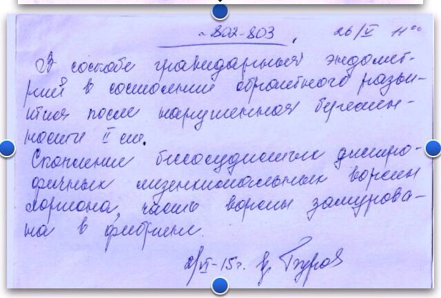 В соскобе гравидарный эндометрий в состоянии обратного развития после нарушенной (?) беременности 2 ст.Скопление бессосудистых (?) дистрофичных мезенхиальных ворсин хориона, часто ворсины замурованы в фибрине