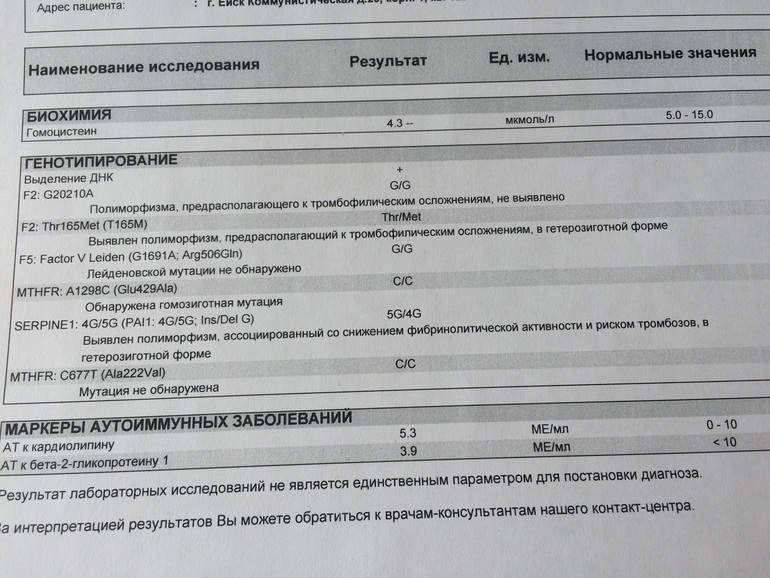 Из этого анализа следует, что все у вас хорошо. Гомозиготная форма одна, в гене фолатного цикла. Будете просто фолиевой пить не 1мг, а 5 мг, и с витамином B. Другое дело, что этот анализ не вполне информативен, тк очень сильно урезан. Факторов тромбофилии минимум 8 (это стандарт), у вас — 3. Генов фолатного цикла обычно 4, у вас 2.