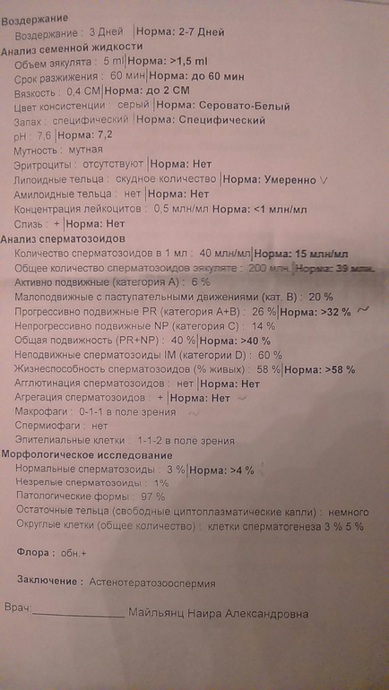 Анализы не из числа свежих. Сданы мужем перед третьим пролетным протоколом в начале осени. С этими анализами ему ничего не назначали, взяли в протокол. Сказали все норм. В итоге пролет. Делали ИКСИ из 6 як только 2 оплодотворились. Остальные на третьем дне развития затормозили. Оплодотворенных два - хорошист и отличник, оба перенесли. Хорошист тоже притормозил на третий день потом продолжил, типа ранняя бластоциста, как сказал эмбриолог. Что скажете, в чем причина? Что надо перепроверить? Пугают те анализы, которые выходят за пределы референсных значений. Врач тогда сказал, что это перенесенные заболевания и лечить их не нужно. Что думаете????