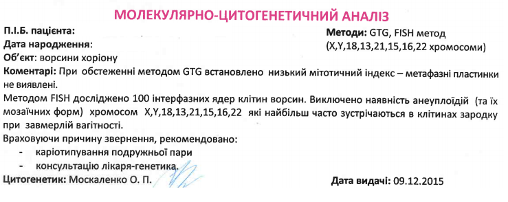 "Комментарии: при обследовании методом GTG выявлен низкий митотический индекс - метафазные пластинки не выявлены.
