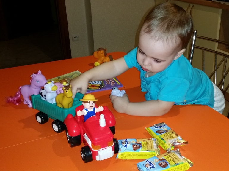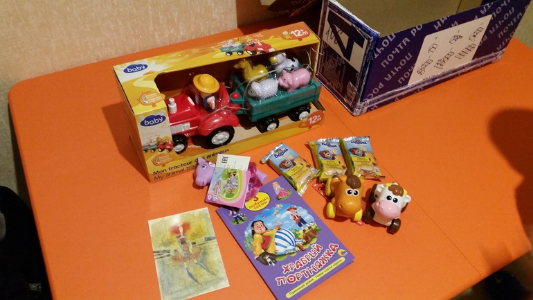Самым первым дочка вытащила игрушечный тягач с фермером и животными в кузове (с музыкой и голосами животных). Ооо, вы бы видели эти восторженные глаза))) Остальное дочка вытаскивала из коробки одной только левой рукой, правой рукой прижимая к себе коробку с тягачом))))))) В посылочке еще были лошадка и коровка на колесиках, резиновая пони с шикарной гривой и расческой для нее (этим игрушкам тоже позже досталось внимание дочки - она и их в итоге загрузила в кузов тягача)))))))))), книжка со сказками, вкусняшки медвежонок Барни и открытка с новогодними поздравлениями)))):