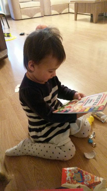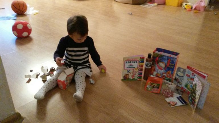 Только так я смогла затащить Свету домой! Подарки смотреть )))) коробку сразу вскрыли, и понеслось! Судьбу коробочки с киндерами видно на фото, Света даже сфотать не дала ))))