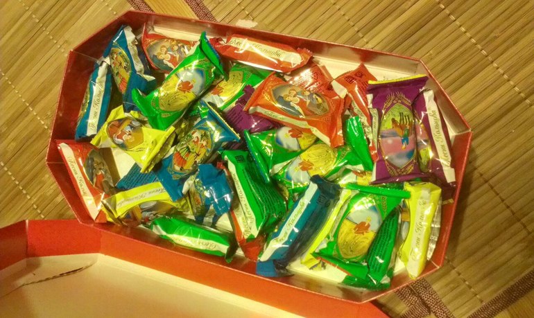Ммммммм видите красную коробку - это такая большая и тяжелая коробочка с воронежскими конфетами! Воронежские не пробовала, кажется, ну эти точно! Вот, открыла чтобы вам показать, но не попробовала пока ни одной - убрала подальше с глаз, потому что мы их на стол поставим в новогоднюю ночь ))