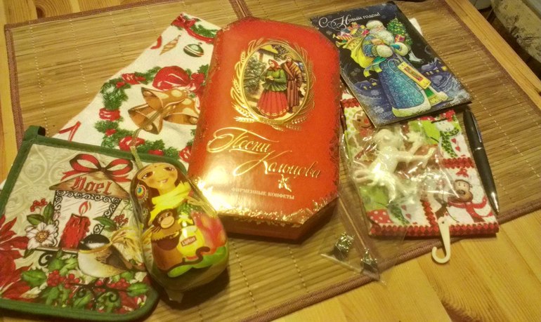 Потрясающие подарки! Во первых, это полотенчики и прихваточка с рождественской расцветкой, это как раз то, что мне надо, так как обживаемся и обновляем в доме все до мелочей!