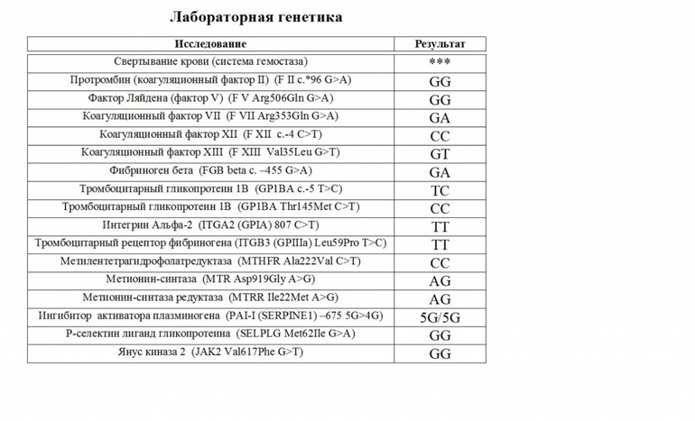 все очень даже ничего у вас. Фактор 7, 8, фибриноген, один из тромбоцит.гликопротеинов, mtr, mtrr гетеро и интегрин альфа 2 гомозигота. Главное нет Лейдена и паи. Вот интегрин гомозигота - вроде они все влияют на незначит.склонность к сгущению
