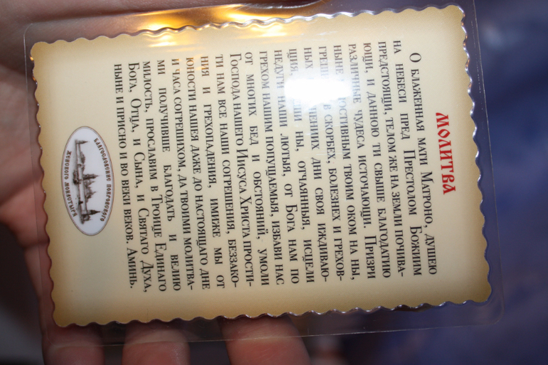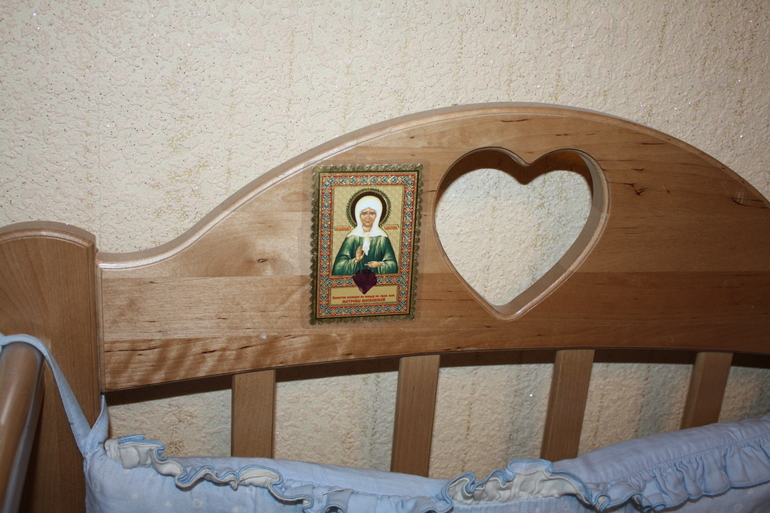 В 2012 году когда ездили к Матронушке я там купила заламинированную иконочку с лепестком освящённым на мощах Матронушки. С этой иконочкой я прошла 2 протокола, потом она у меня стояла в кроватке у малыша, а потом я её приклеила на скотч к кроватке.